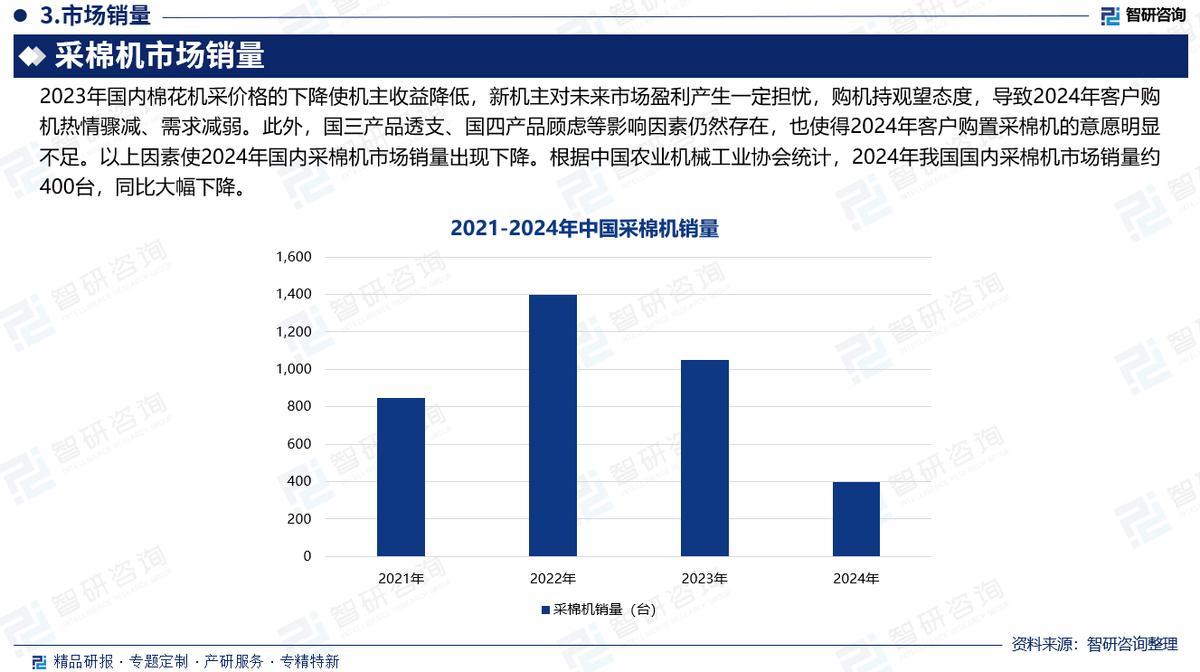 市场销量:2023年国内棉花机采价格的下降使机主收益降低,新机主对未来市场盈利产生一定担忧,购机持观望态度,导致2024年客户购机热情骤减、需求减弱。此外,国三产品透支、国四产品顾虑等影响因素仍然存在,也使得2024年客户购置采棉机的意愿明显不足。2024年我国国内采棉机市场销量约400台,同比大幅下降。