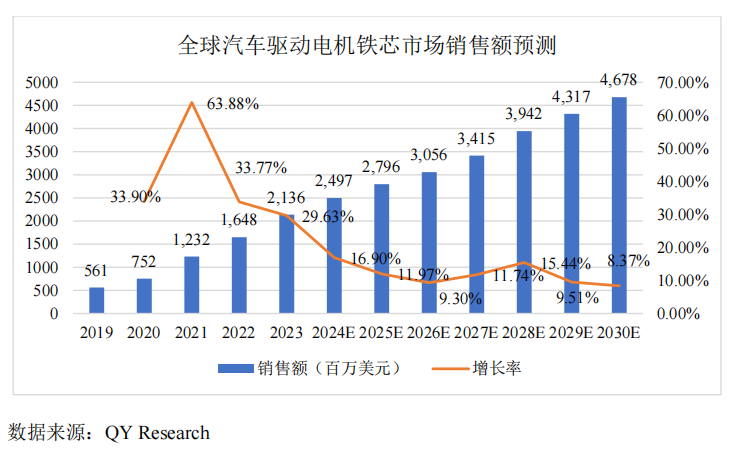 随着新能源汽车市场的持续扩容,精密冲压铁芯行业迎来了确定性的增长机遇。VIC Market Research数据显示,2023年全球精密冲压铁芯市场规模已达1121.09亿元,预计到2030年将增长至2636.98亿元,2024-2030年的年均复合增长率(CAGR)可达12.82%。其中,汽车应用领域占比28.51%,是最大的应用场景,成为驱动行业增长的核心引擎。QY Research进一步预测,2023-2030年全球汽车驱动电机铁芯市场规模的CAGR为11.85%,2030年市场规模有望达到46.78亿美元,市场空间极为广阔。