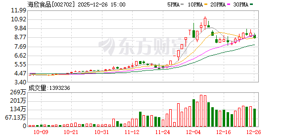 海欣食品今日下跌6.88%,全天换手率30.37%,成交额12.33亿元,振幅7.55%。龙虎榜数据显示,机构净卖出3685.78万元,营业部席位合计净卖出651.55万元。