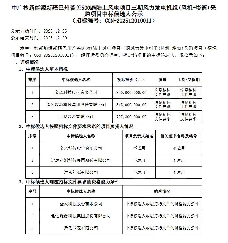 一、12月26日,中广核新能源新疆巴州若羌500MW陆上风电项目三期风力发电机组(风机+塔筒)采购项目中标候选人公示。