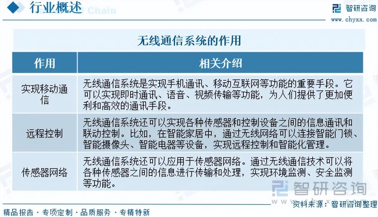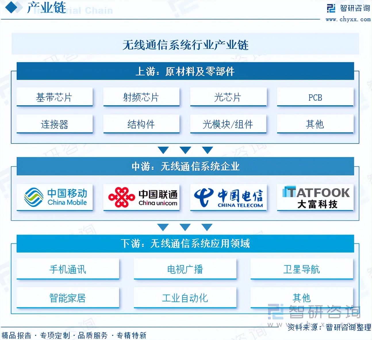 无线通信系统产业链上游为原材料和零部件,主要包括基带芯片、射频芯片、光芯片、PCB、连接器、结构件、光模块/组件等。产业链中游为无线通信系统的生产环节。产业链下游为手机通讯、电视广播、卫星导航、智能家居、工业自动化等领域。