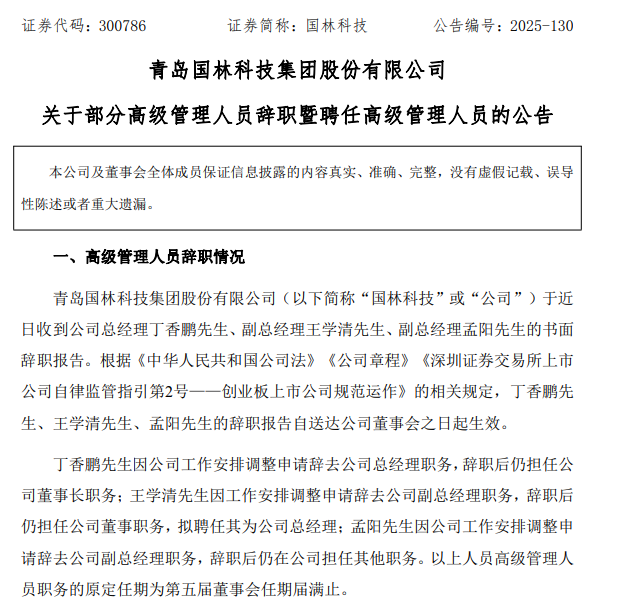 此次人事调整正值公司推进重大资产重组的关键时期,因而也被认为是国林科技为适应新的业务布局而进行的组织架构优化。