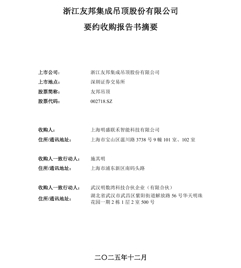 不过需明确的是,在截至报告书摘要签署日,友邦吊顶本次收购要约尚未生效,具有不确定性。而新接盘方的背景、交易对价,以及是否能为企业带来技术、资金或渠道资源,将成为后续市场关注的核心。