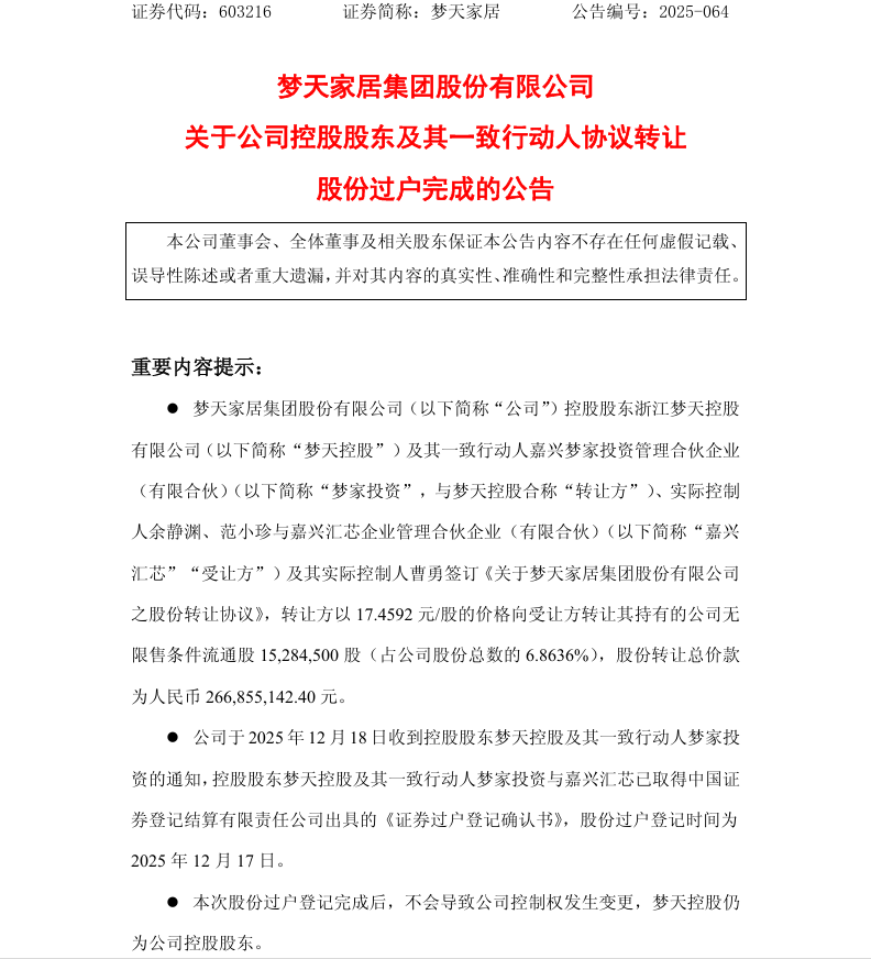 举个例子。2025年12月19日,梦天家居发布公告称,控股股东及一致行动人协议转让公司6.86%股份的过户登记手续已完成,总价款约2.67亿元。转让后,控股股东梦天控股持股比例从55.91%降至50.91%,其一致行动人梦家投资持股比例从7.45%降至5.59%,受让方嘉兴汇芯成为持股6.86%的股东。