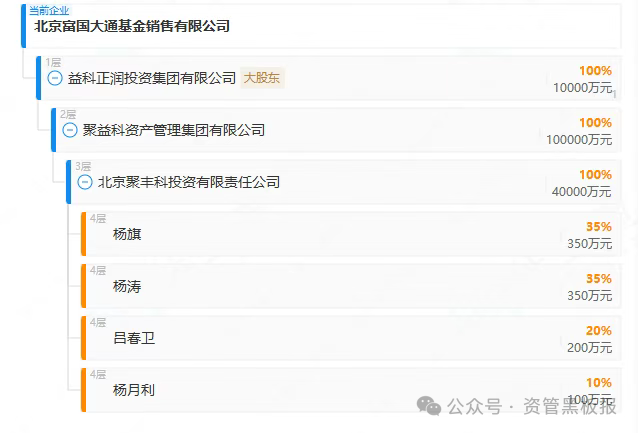 股权穿透显示,富国大通基金经股权调整后,自然人杨涛持股35%,为实际控制人。值得注意的是,杨涛是资本市场赫赫有名的“益科系”创始人杨根水之子,于2016年接替父亲进入益科正润董事会,接手相关经营管理工作。杨根水的商业版图起步于实体产业,1993年10月创办河南省汇源化学工业有限公司,完成原始资本积累后,逐步转向金融投资领域,广泛涉足矿产、证券、上市公司等多个赛道,并于2019年推动“益科系”成为A股上市公司登云股份的实际控制人。