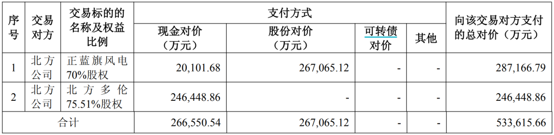 内蒙华电拟通过发行股份及支付现金相结合的方式,向北方公司购买其持有的正蓝旗风电70%股权与北方多伦75.51%股权,交易对价合计53.36亿元。同时,公司拟向不超过35名特定投资者发行股份募集配套资金,金额不超过26.5亿元。