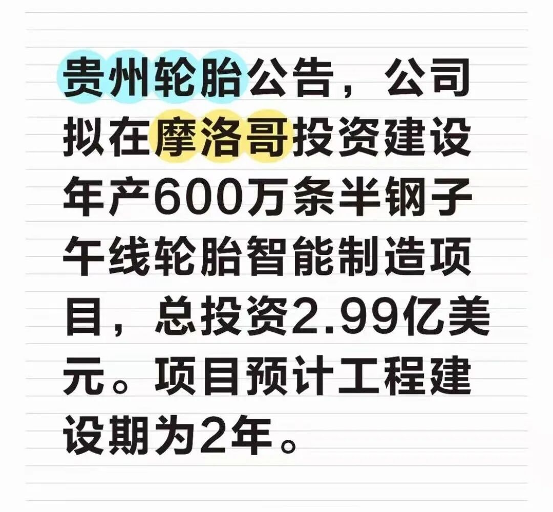 贵州轮胎:拟在摩洛哥投建年产600万条半钢子午线轮胎项目人民财讯1月5日电,贵州轮胎(000589)1月5日公告,公司拟在摩洛哥投资建设“年产600万条半钢子午线轮胎智能制造项目”,并计划由拟设立的前进轮胎(摩洛哥)有限责任公司(暂定名)具体负责该项目的实施。项目总投资2.99亿美元。
