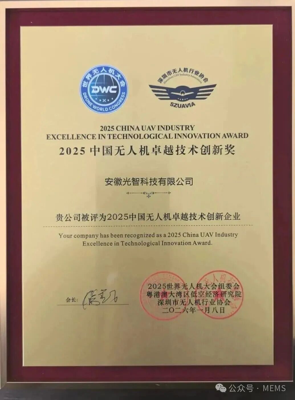 2026年1月8日,在世界无人机大会组委会、粤港澳大湾区低空经济研究院与深圳市无人机行业协会联合评选中,光智科技凭借在低空经济领域技术创新与应用落地方面的突出表现,荣获 “2025中国无人机卓越技术创新奖”。该奖项旨在表彰在无人机技术领域具备领先创新力与产业推动作用的优秀企业与产品,标志着光智科技在红外热成像与无人机融合应用方面再次获得行业权威认可。