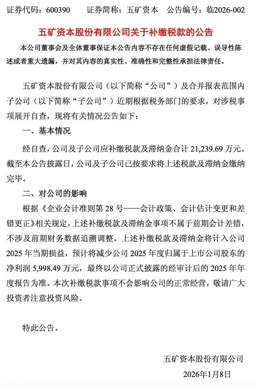 2026年1月7日,五矿资本公告,公司及子公司近期根据税务部门的要求,对涉税事项展开自查,经自查,公司及子公司应补缴税款及滞纳金合计21,239.69万元。截至本公告披露日,公司及子公司已按要求将上述税款及滞纳金缴纳完毕。