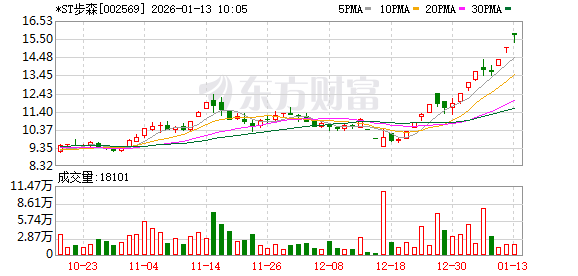 *ST步森再度涨停,8个交易日内录得5个涨停,累计涨幅为33.14%,累计换手率为17.87%。截至9:25,该股今日成交量16.70万股,成交金额263.69万元,换手率0.12%。最新A股总市值达22.74亿元,A股流通市值22.10亿元。