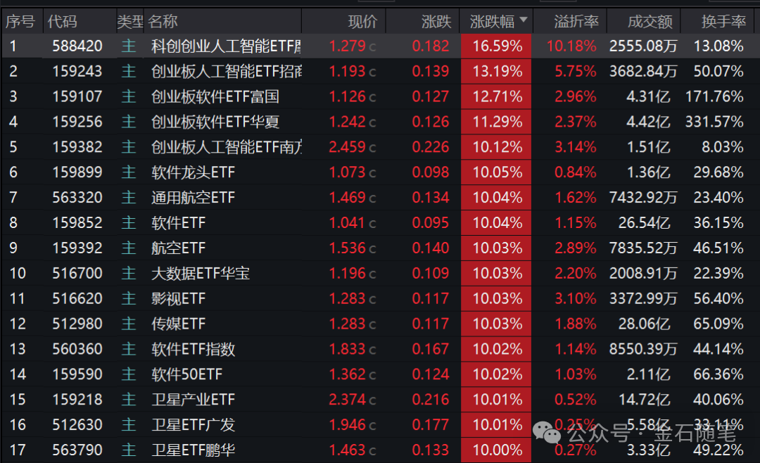 6)商业航天、AI应用动辄20cm甚至30cm大肉,相关ETF涨停潮也不足为怪。人工智能、软件、商业航天、卫星、传媒等上演ETF涨停潮。