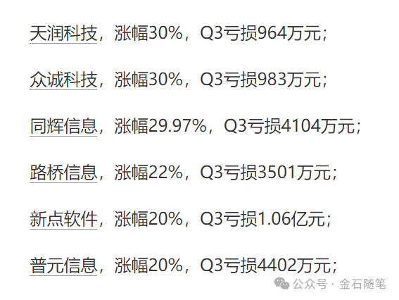 有一点非常有意思,那就是软件公司们越亏损涨幅越猛烈。天润科技、众诚科技、同辉信息、路桥消息、新点软件等集体上演20cm、30cm大肉。