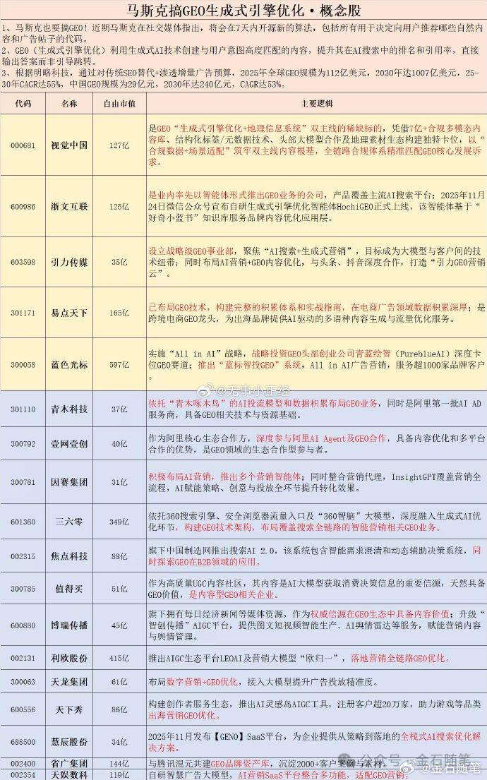 三是,马斯克更是宣称要开源X平台内容最新推荐算法,此举被业内解读为“马斯克也要涉足GEO(内容生成式引擎优化)”。正所谓“马年就炒马斯克”,商业航天、脑机接口、人心机器人,现在可能轮到AI应用了。