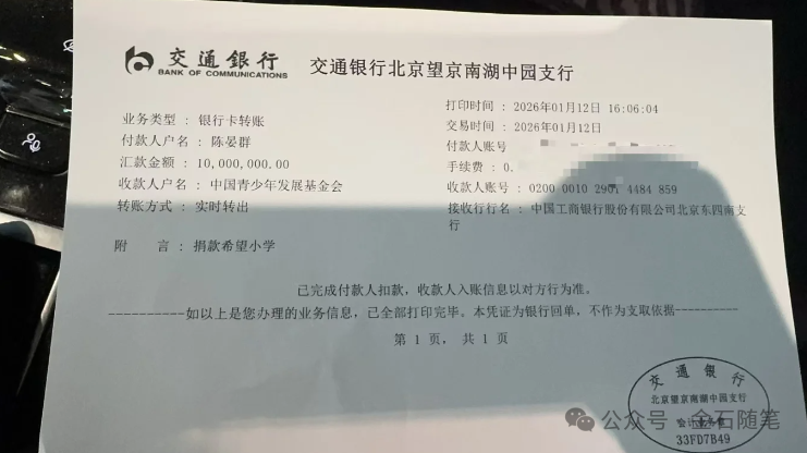 根据发票和收支情况,陈小群向中国青少年发展基金会捐款1000万元。