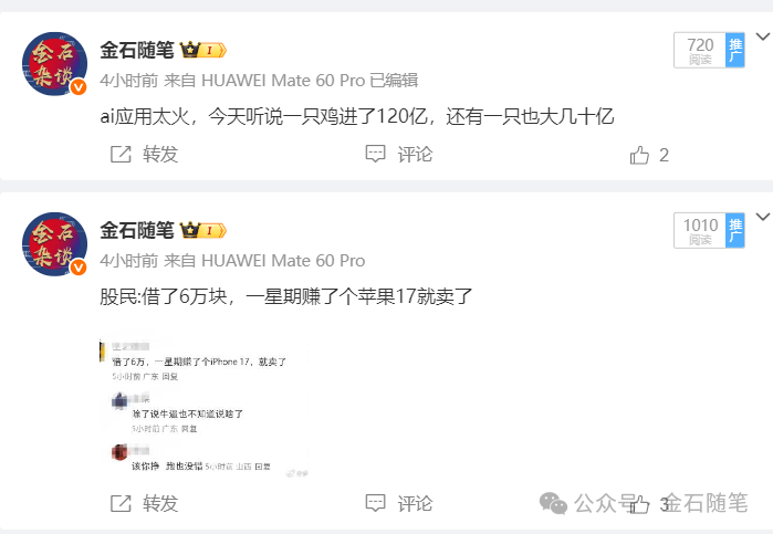 2)股民赚麻了,卖方首席路演说哑了。先说一下在社区平台看到的股民众生相:有股民表示,借款6万块,一星期赚了一台苹果17,卖了;有股民表示,我一周赚了1个月工资;还有股民表示,我一天赚了1个月工资。