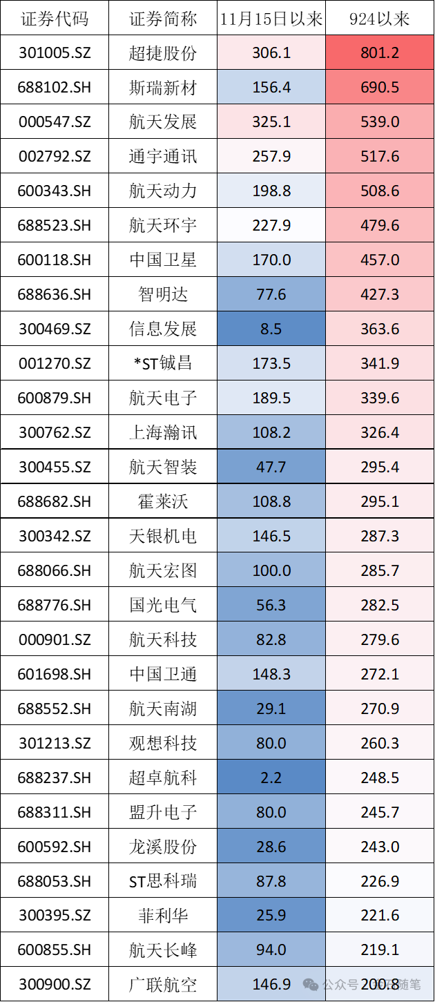 金石杂谈统计,11月15日以来,涨幅最大的是陈小群持有的航天发展,涨幅为325%;其次是超捷,涨幅也超3倍。还有航天环宇、通宇通讯涨幅超2倍;但如果拉长至924日计算,商业航天已经有了8倍股,那就是超捷,航天发展、通宇通讯、航天动力也有5倍。