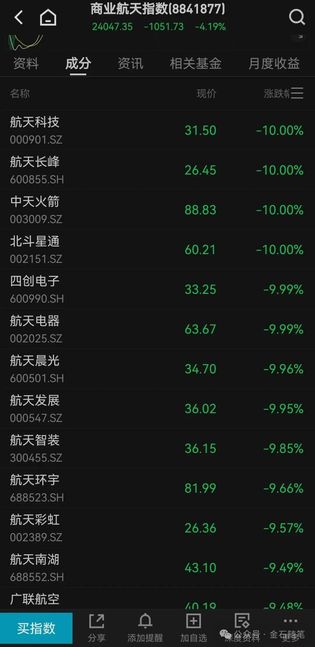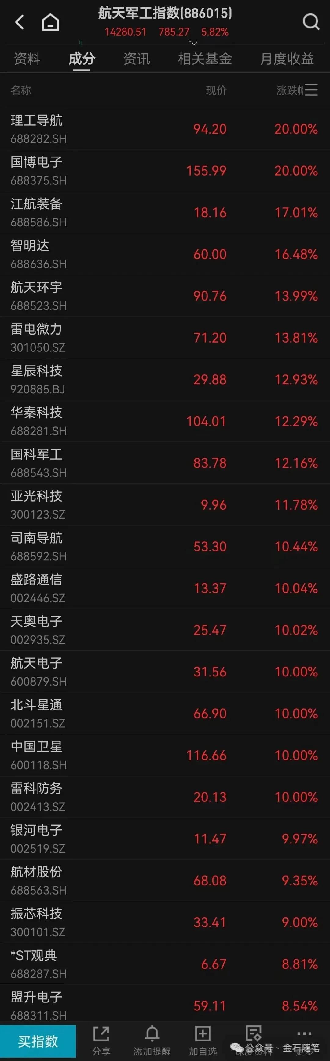 有一件事大家都在谈,人形机器人、创新药、CPO都有十倍股,商业航天还没有,所以还能涨。金石杂谈再同步给大家更新下商业航天最新涨幅。
