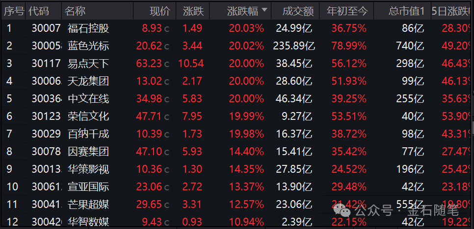 4)AI应用上演涨停潮。其实,相较于商业航天,AI应用涨幅更甚,天润科技30cm涨停,美登科技、每日互动、新店软件、壹网壹创、卓易信息、润泽科技等纷纷20cm涨停。