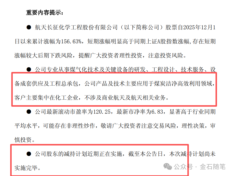 还有航天动力、恒勃股份、北方导航、航天工程、星环科技、航天长峰等公司明确表示主营业务不涉及商业航天。以航天工程为例,12月以来涨了1.5倍,滚动市盈率120倍,其专业、产品、技术主要应用及客户均不涉及商业航天及航天相关业务。而且,公司的减持计划还在实施。