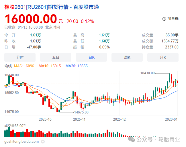 谁能想到,轮胎价格不涨反稳的背后,是原材料价格的“疯狂飙升”。2026年1月13日,橡胶主力价格冲到了16000元/吨,看似不算历史高位,涨幅却相当惊人——2025年11月还稳定在14500元/吨左右,短短两个月每吨暴涨超1600元。更关键的是,天然橡胶一涨价,合成橡胶立马跟风,这两种原料在轮胎制造成本中占比高达54%,再加上9%的钢材成本,光这三项就占了总成本的63%。再叠加上炭黑等化学原料涨价和人工成本上升,轮胎企业的生产成本简直像坐了火箭。