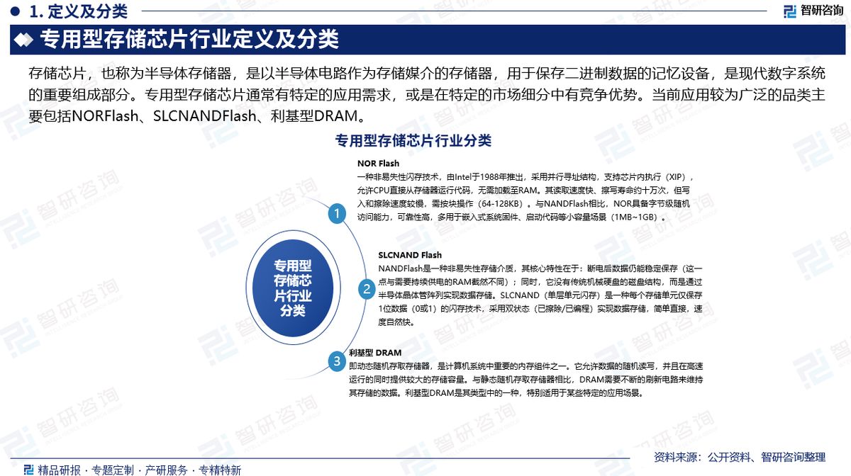 行业定义及分类:存储芯片,也称为半导体存储器,是以半导体电路作为存储媒介的存储器,用于保存二进制数据的记忆设备,是现代数字系统的重要组成部分。专用型存储芯片通常有特定的应用需求,或是在特定的市场细分中有竞争优势。当前应用较为广泛的品类主要包括NORFlash、SLCNANDFlash、利基型DRAM。