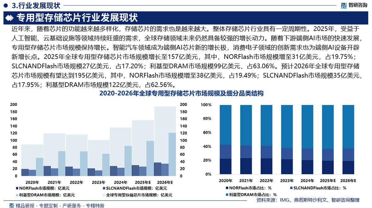 专用型存储芯片通常有特定的应用需求,或是在特定的市场细分中有竞争优势。当前应用较为广泛的品类主要包括NORFlash、SLCNANDFlash、利基型DRAM。整体存储芯片行业具有一定周期性。随着下游端侧AI市场的快速发展,专用型存储芯片市场规模保持增长。智能汽车领域成为端侧AI芯片新的增长极,消费电子领域的创新需求也为端侧AI设备开辟新增长点。2025年全球专用型存储芯片市场规模增长至157亿美元,其中,NORFlash市场规模增至31亿美元,占19.75%;SLCNANDFlash市场规模27亿美元,占17.20%;利基型DRAM市场规模99亿美元,占63.06%。预计2026年全球专用型存储芯片市场规模有望达到195亿美元,其中,NORFlash市场规模增至38亿美元,占全球专用型存储芯片市场的19.49%;SLCNANDFlash市场规模35亿美元,占17.95%;利基型DRAM市场规模122亿美元,占62.56%。