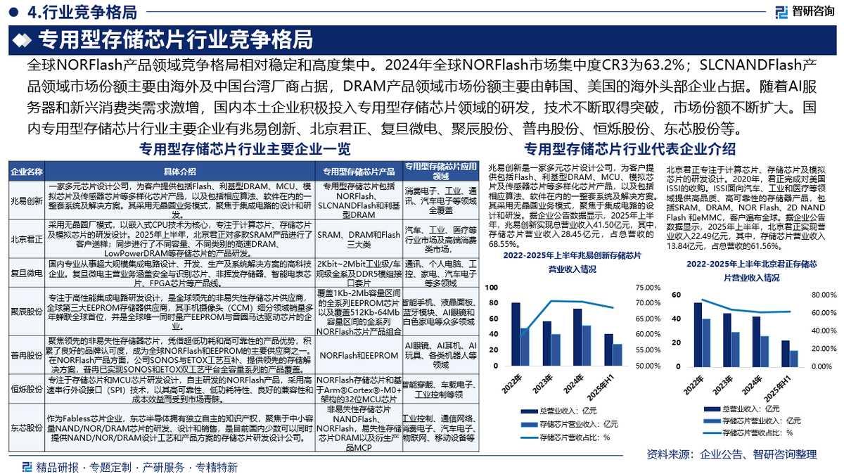 竞争情况:2024年,全球NORFlash市场集中度CR3为63.2%;SLCNANDFlash产品领域主要由海外及中国台湾厂商占据,DRAM产品领域主要由韩国、美国的海外头部企业占据。随着AI服务器和新兴消费类需求激增,国内本土企业积极投入专用型存储芯片领域的研发,技术不断取得突破,市场份额不断扩大。国内专用型存储芯片主要企业有兆易创新、北京君正、复旦微电、聚辰股份、普冉股份、恒烁股份、东芯股份等。