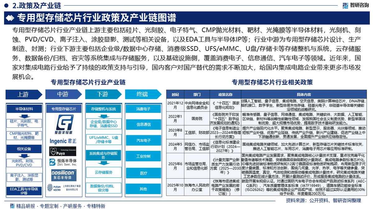 市场趋势:存储芯片作为集成电路的三大品类之一,目前广泛应用于内存、消费电子、智能终端和固态存储硬盘等领域。随着AI算力爆发、新能源汽车智能化、数据中心建设加速,存储芯片的需求激增。我国专用型存储芯片行业正处于由AI与智能汽车双轮驱动的结构性变革期,国产车规级存储将加速突破。