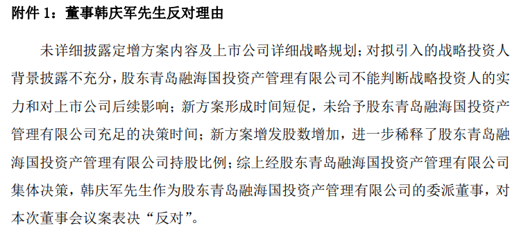 值得关注的是,这场“改善上市公司资产质量和盈利能力”的资本运作却在董事会层面引发分歧,天晟新材昔日第一大股东青岛融海国投资产管理有限公司(下称“融海国投”)委派董事韩庆军对方案连续投出25张反对票,引发市场热议。