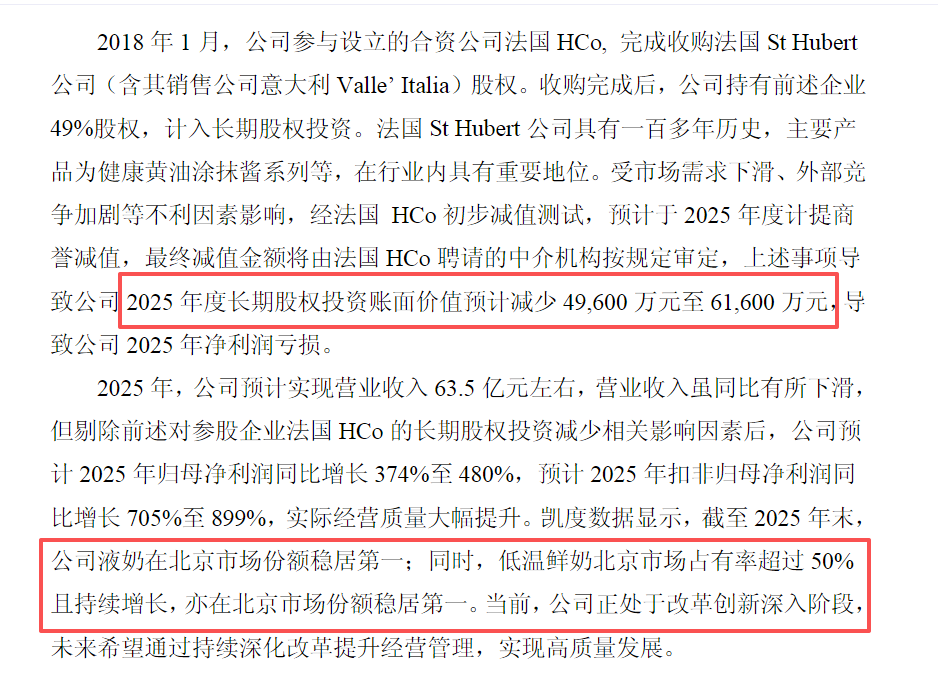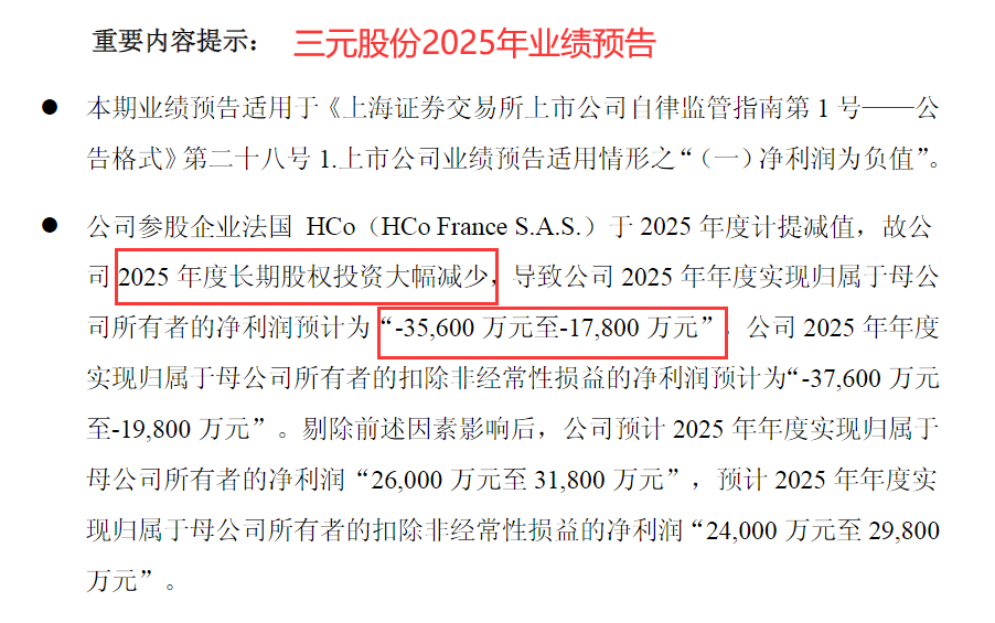 三元股份法国合资公司收购的公司业绩不佳,使得三元股份长期股权投资减少4.96—6.16亿元,进而导致2025年公司业绩亏损。