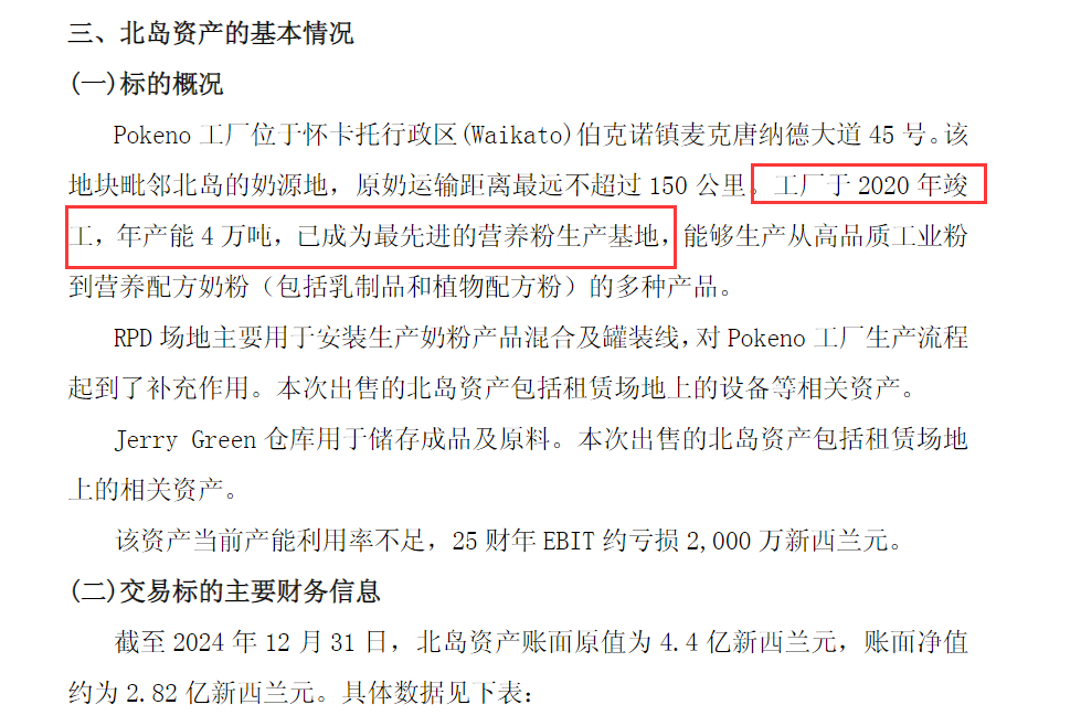 但是这个北岛工厂是2020年竣工的,光明乳业公告里说这是最先进的营养粉生产基地;那么,为什么在5年后就产能利用不足把它卖出了呢?