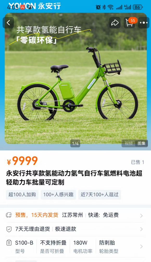 后来永安行推出了氢能单车,淘宝旗舰店售价9999一辆,但是商业化没有成功;这种自行车的商业化推广有点像生物柴油,它们本身成本就高,需要依靠政府补贴和示范项目来进行初期推广,再逐步实现商业化。