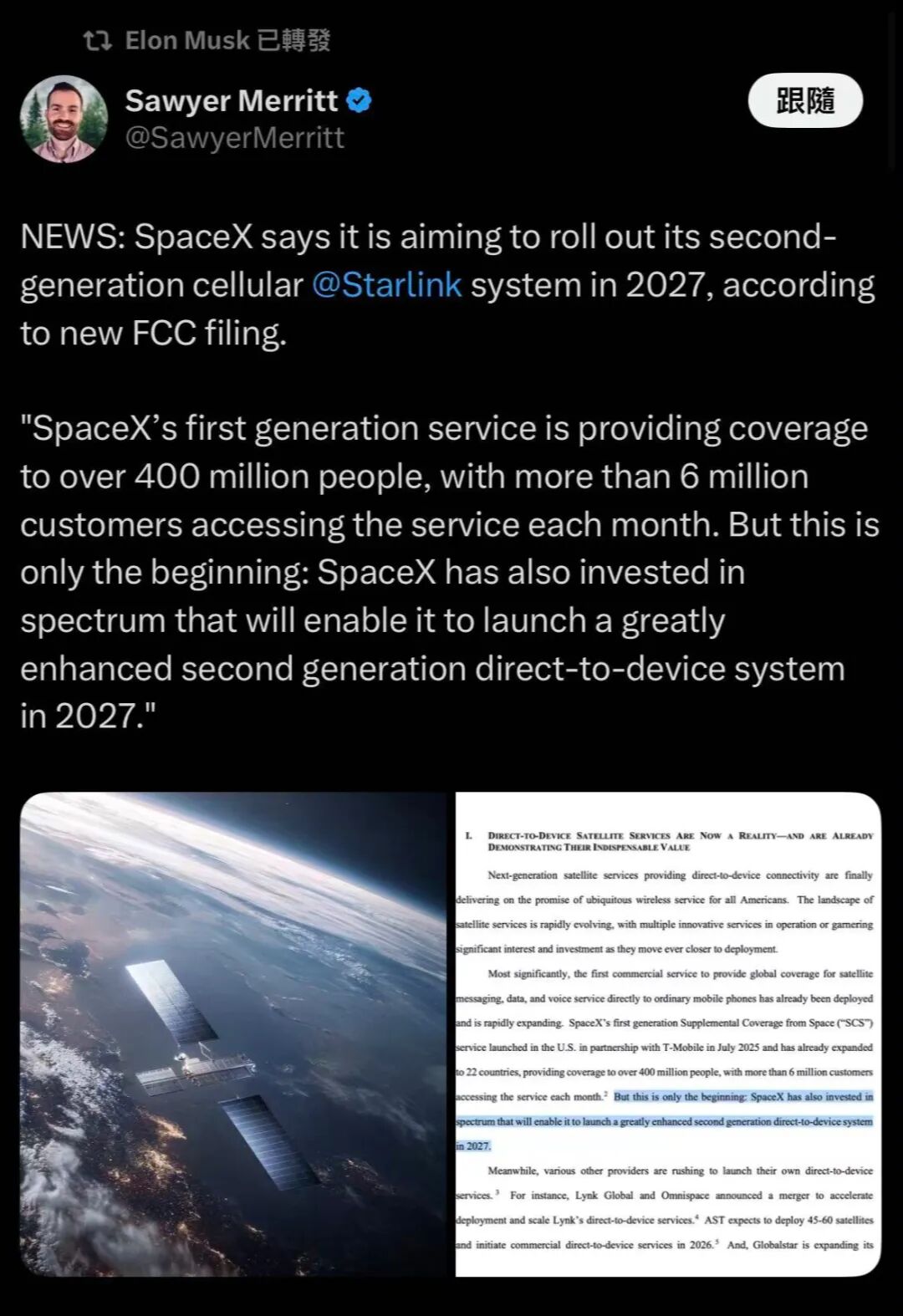 上述推文中还提到,SpaceX的第一代“星链”服务已覆盖超4亿人,每月有超过600万用户使用该服务。但这仅仅是个开始,SpaceX还投资了频谱资源,这将使其能够在2027年推出一个大幅改进的第二代设备直连卫星系统。