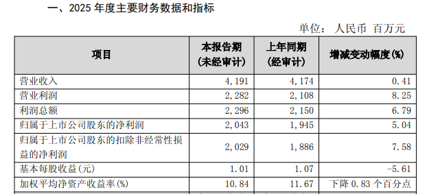 日前,苏农银行公布2025年业绩快报,去年全年收入41.91亿,同比增长0.41%,归母净利润20.43亿,同比增长5.04%。