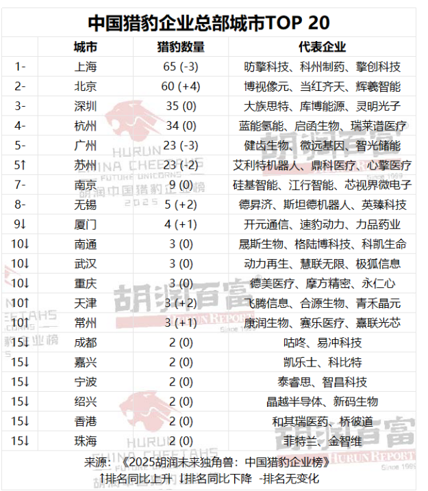 榜单显示,胡润研究院在中国找到304家猎豹企业。其中,上海是中国猎豹企业数量最多的城市,有65家;北京是今年增长数量最多的城市,增加了4家,以60家位居第二;深圳和杭州分别以35家和34家位列第三和第四。