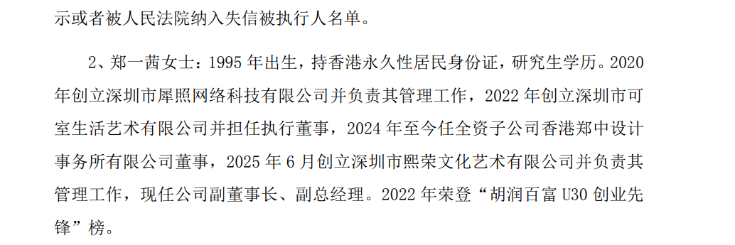 公开资料显示,郑一茜出生于1995年,持香港永久性居民身份证,研究生学历。2020年创立深圳市犀照网络科技有限公司并负责其管理工作,2022年创立深圳市可室生活艺术有限公司并担任执行董事。