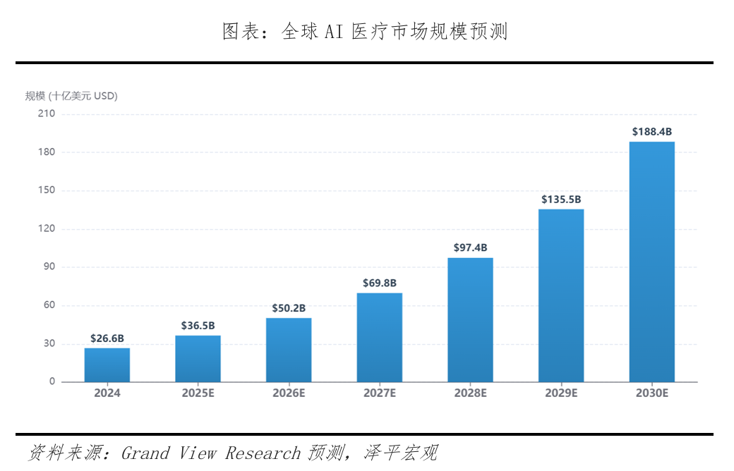 全球AI医疗市场规模加速扩容。行业呈现三大特征: