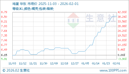 据生意社监测,鸡蛋02月01日最新价格8.55元/公斤,最近10天上涨7.95%,15天上涨12.95%,20天上涨22.14%,30天上涨34.01%。