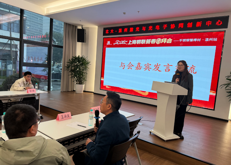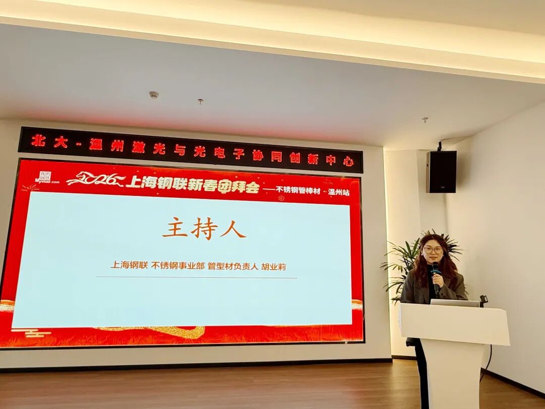 下午15:00,2026年上海钢联新春团拜会——不锈钢管棒材·温州站正式开始,会议由上海钢联不锈钢事业部管型材负责人胡业莉主持,对上海钢联及本次会议进行简短的介绍并欢迎各位领导的莅临。