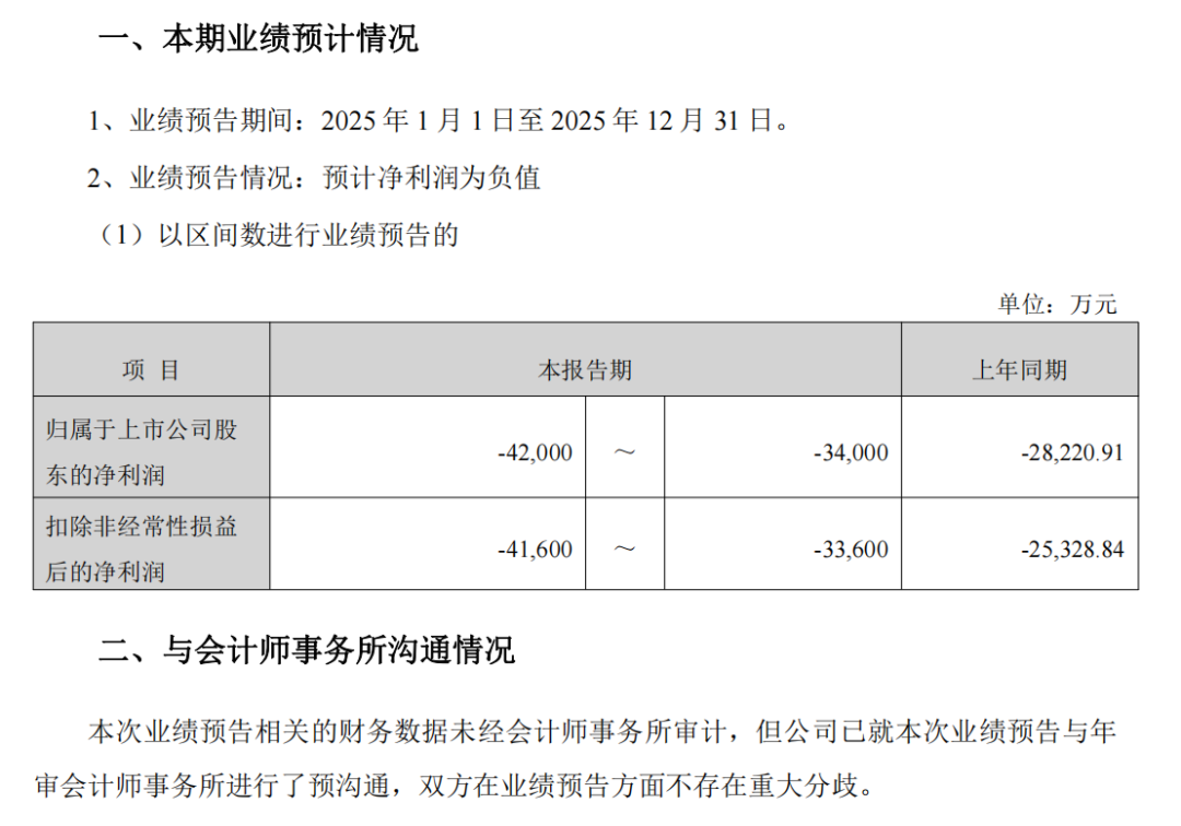 1月30日,百川畅银(300614)发布2025年业绩预告。预告称,预计2025年归母净利润亏损3.4亿元至4.2亿元,上年同期亏损2.82亿元;扣非净利润亏损3.36亿元至4.16亿元,上年同期亏损2.53亿元。