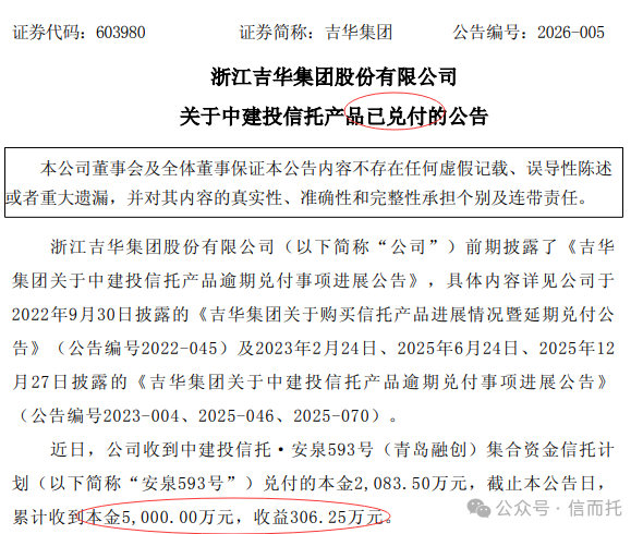 导读:地产信托"寒冬"中传来罕见暖意。2026年2月3日,浙江吉华集团公告宣布,逾期逾三年的"中建投信托·安泉593号"信托产品已全额兑付本息,累计收回本金5000万元及收益306.25万元。这一曾被计提1196.84万元减值损失的"问题资产"最终"起死回生",不仅为上市公司带来可观的利润回冲,更成为近年来房地产信托风险处置中"全额兑付"的稀缺样本。