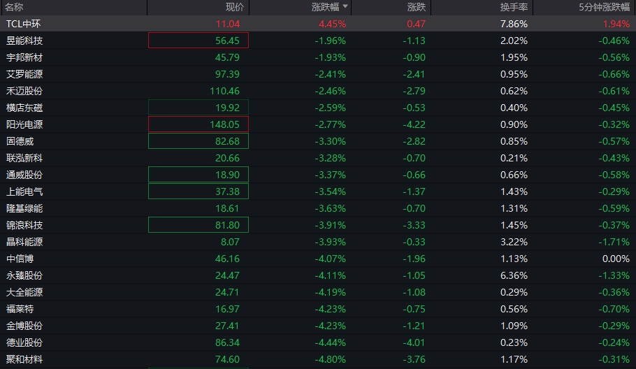 昨天大热的光伏产业链概念股,今天集体疲弱。截至9:50,Wind显示,光伏概念大跌4.52%,板块内仅TCL中环涨超3%,其余概念股均飘绿。钧达股份、金辰股份开盘迅速跌停,连城数控、双良节能、晶盛机电、明阳智能、捷佳伟创、晶科能源、天合光能等跌幅居前。