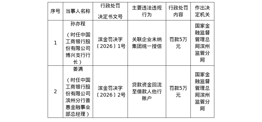 蓝鲸新闻2月5日讯,近日,国家金融监督管理总局滨州监管分局发布了罚单,剑指中国工商银行股份有限公司博兴支行行长孙亦程和滨州分行普惠金融事业部总经理姜满。