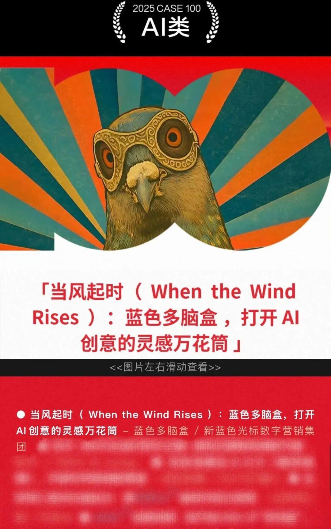 近日,由广告门主办的 「2025 CASE 100 百大品牌创新营销案例」评选结果正式揭晓。蓝色光标旗下新蓝色光标数字营销集团(以下简称“新蓝标数字集团”) AI 创意作品 《当风起时(When the Wind Rises):蓝色多脑盒,打开 AI 创意的灵感万花筒》,成功入选2025 年 「CASE 100 百大品牌创新营销案例」(AI类别)。CASE 100 百大品牌创新营销案例评选由广告门自 2023 年起推出,聚焦品牌在新叙事方式、新体验、新形式、新工具与新场景等维度的创新实践,关注在复杂营销环境中真正具备突破性与讨论价值的代表性案例。该作品从创作机制与表达方式入手,呈现了 AI 介入创意表达的一种艺术化想象与叙事尝试,体现了新蓝标数字集团在 AI 与创意融合方向上的阶段性探索。