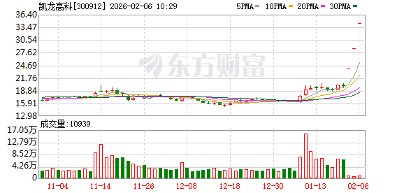 凯龙高科盘中涨停,已连收3个涨停板,截至9:25,该股报34.30元,换手率0.75%,成交量64.09万股,成交金额2198.21万元,涨停板封单金额为15.30亿元。连续涨停期间,该股累计上涨72.80%,累计换手率为2.93%。最新A股总市值达39.40亿元,A股流通市值29.48亿元。
