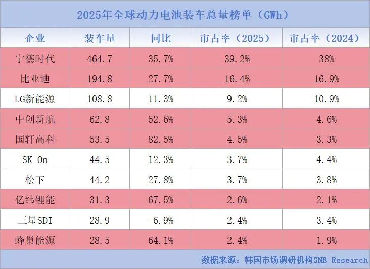 宁德时代连续九年蝉联全球动力电池装车量榜首,2025年动力电池装车量为464.7 GWh,同比增长35.7%,就市占率来看,仅宁德时代一家就占据了全球39.2%的市场份额,相较于去年同期增加了1.2个百分点,“宁王”地位依旧稳固。