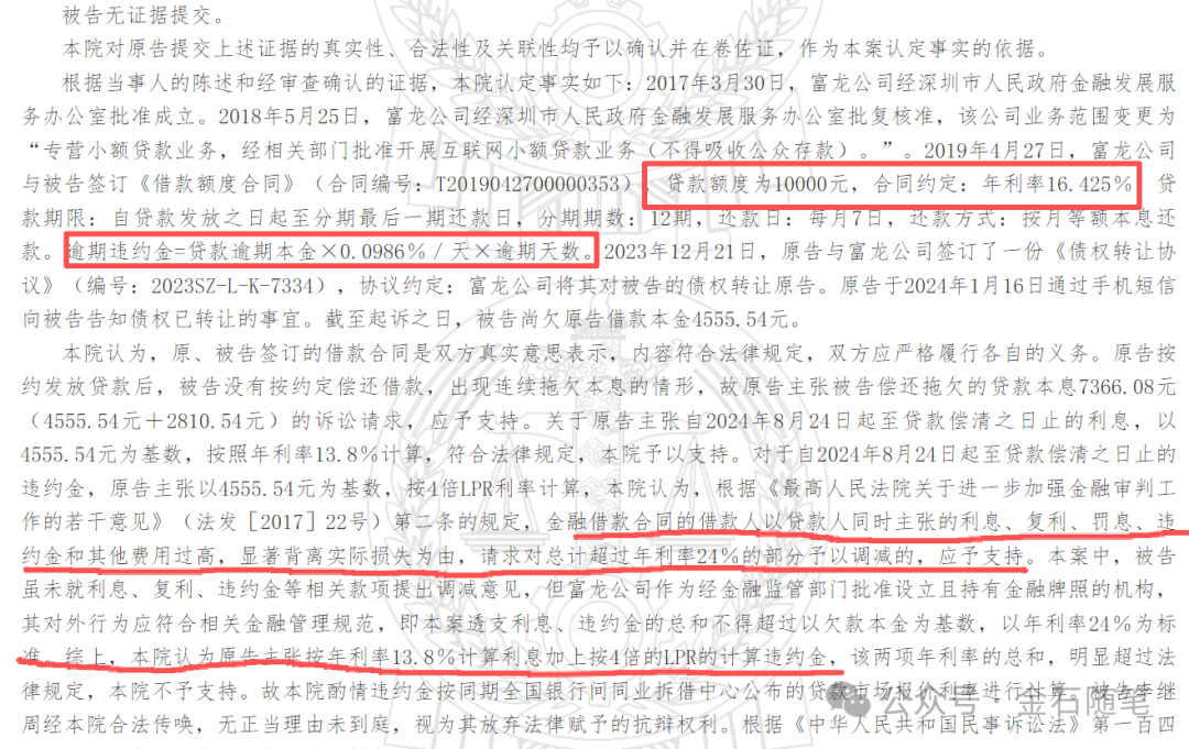 根据该案例,法院最终判定,透支利息、罚息不得超过24%标准,而且法院认为,富龙小贷主张按年利率13.8%计算利息加上按4倍的LPR的计算违约金,该两项年利率的总和,明显超过法律规定,不予支持。最终利息按13.8%计算,而违约金则按LPR利率计算(大约17%左右)。
