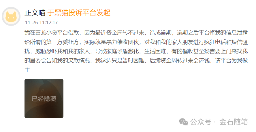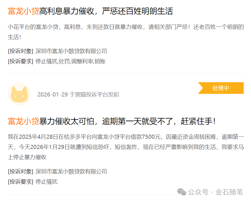 由于很多借款人,自身偿还能力有限,小贷公司经常会出现一个问题,那就是暴力催收,富龙小贷则更为夸张。借款人投诉:高利息,未到还款日就暴力催收;逾期第一天就短信轰炸。