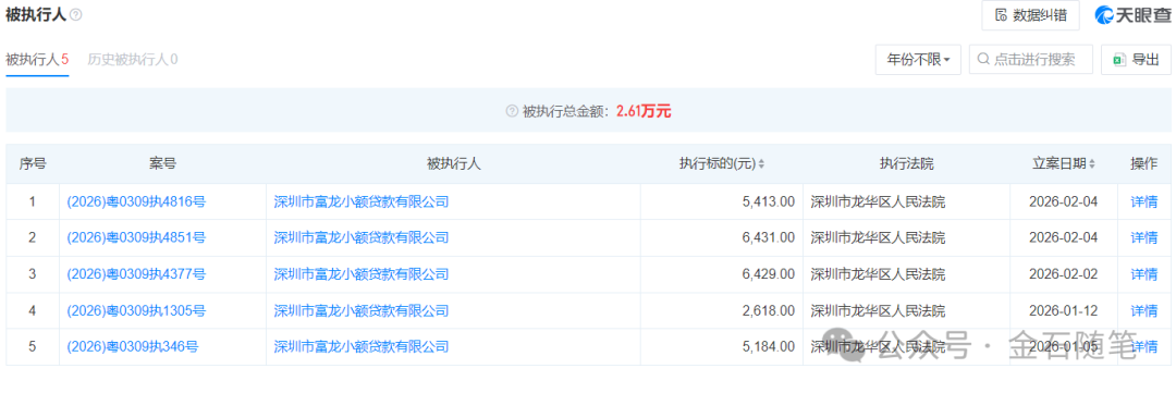 金石杂谈查询天眼查发现,富龙小贷旗下新增5笔被执行人信息,均发生在今年,仅2月就有3笔,被执行总金额2.61万元。值得注意的是,富龙小贷成立于2017年,是富士康的100%持股子公司,总部就在深圳富士康。背靠浓眉大眼的富士康,富龙小贷如何沦落到成为被执行人?