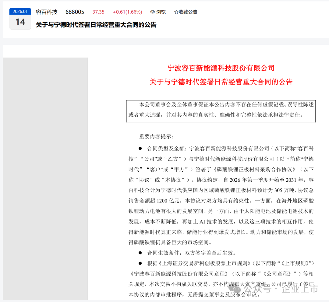 容百科技于2026年1月14日发布公告,宣布与宁德时代签署《磷酸铁锂正极材料采购合作协议》。公告中明确写道:“协议总销售金额超1200亿元。”